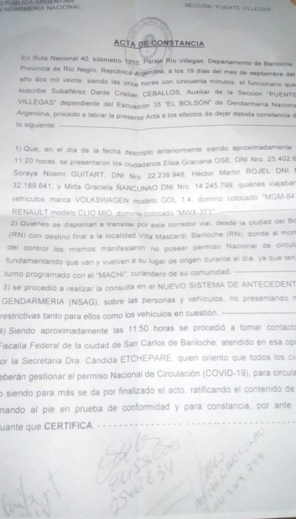 En la mañana del 19 de Septiembre del 2020, cuatro personas mapuche viajaban desde su territorio para atenderse con la machi. Sin embargo, al llegar a Río Villegas —cuando cruza la ruta 40 que une Bariloche con El Bolsón— lxs agentes de gendarmería les impiden continuar su viaje por no contar con el permiso de circulación habilitante y labran un acta sobre la situación.
