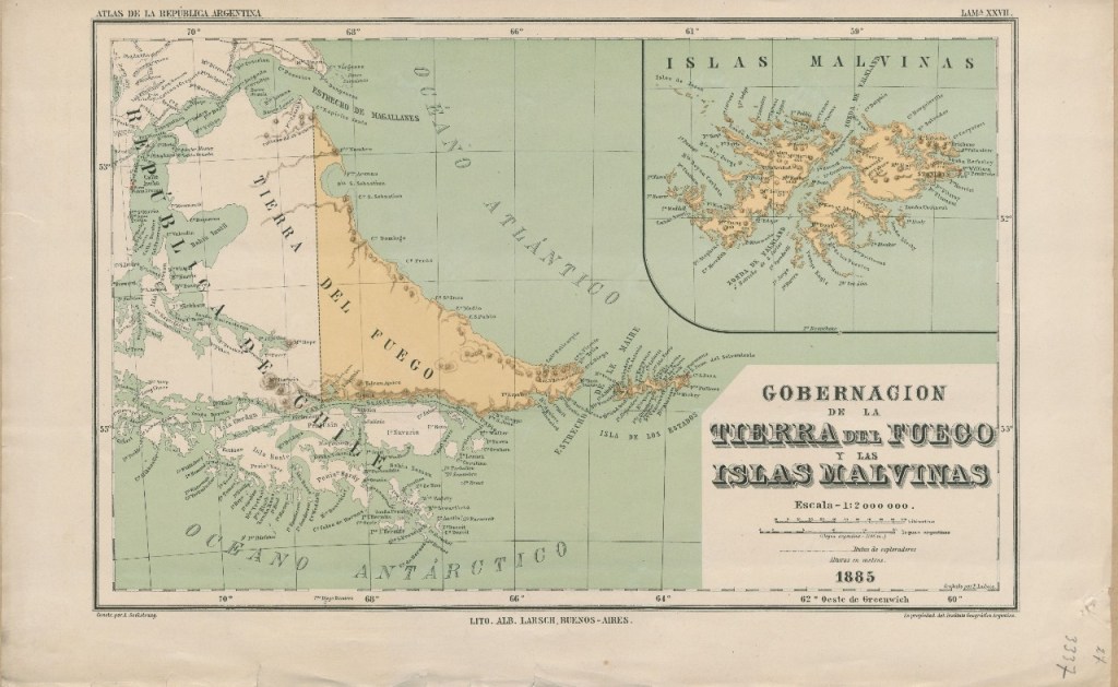 Seelstrang, Arturo (1885). Atlas de la República Argentina. Gobernación de la Tierra del Fuego y las Islas Malvinas. Buenos Aires: Instituto Geográfico Argentino.