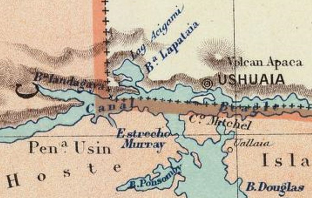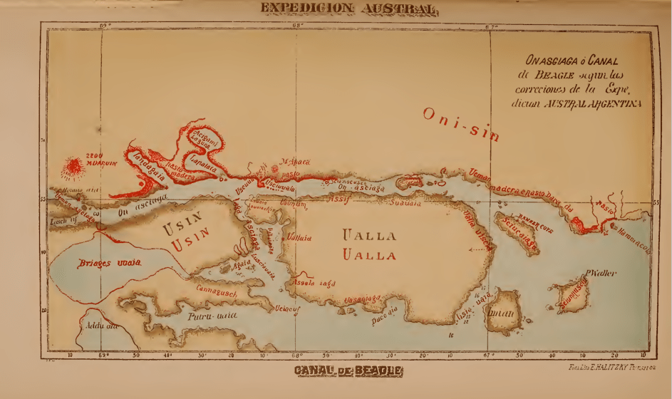De este modo, Acigami, la “bolsita alargada” de los yaganes, fue dividida por una línea geodésica renombrada al oeste (en Chile) como Presidente Errazuriz y al este (en Argentina) como Presidente Roca. Es recién en el siglo XX cuando dichos topónimos son incorporados en la cartografía, como una muestra simbólica de la soberanía disputada entre ambos países. Estas denominaciones espacializan la memoria del genocidio y el reparto de los territorios indígenas entre ambos Estados y, en simultáneo, invisibilizan su historia y conocimientos vaciándolos de contenido.