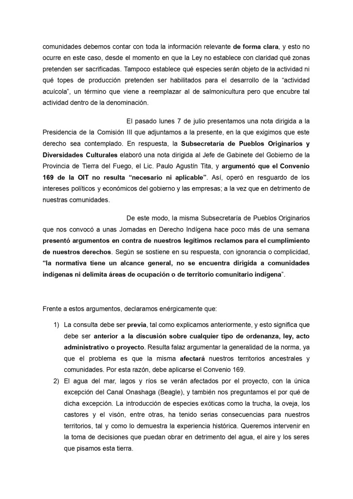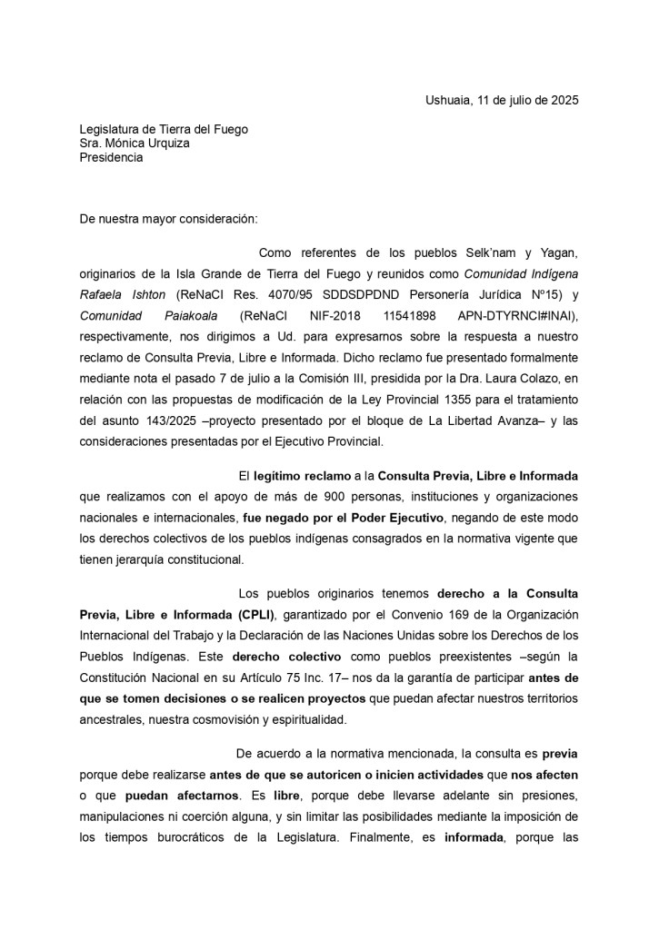 El 8 de agosto, la Legislatura de Tierra del Fuego AeIAS se reunió nuevamente en Comisión para el tratamiento de la propuesta de modificación de la Ley Provincial 1355, que prohíbe la salmonicultura en todo el territorio de la provincia. En esta oportunidad, se leyó la respuesta de la Comunidad Indígena Rafaela Ishton del pueblo Selk’nam y de la Comunidad Indígena Yagán Paiakoala al posicionamiento del Poder Ejecutivo Provincial, que el pasado 8 de julio decidió negar este derecho a las comunidades.