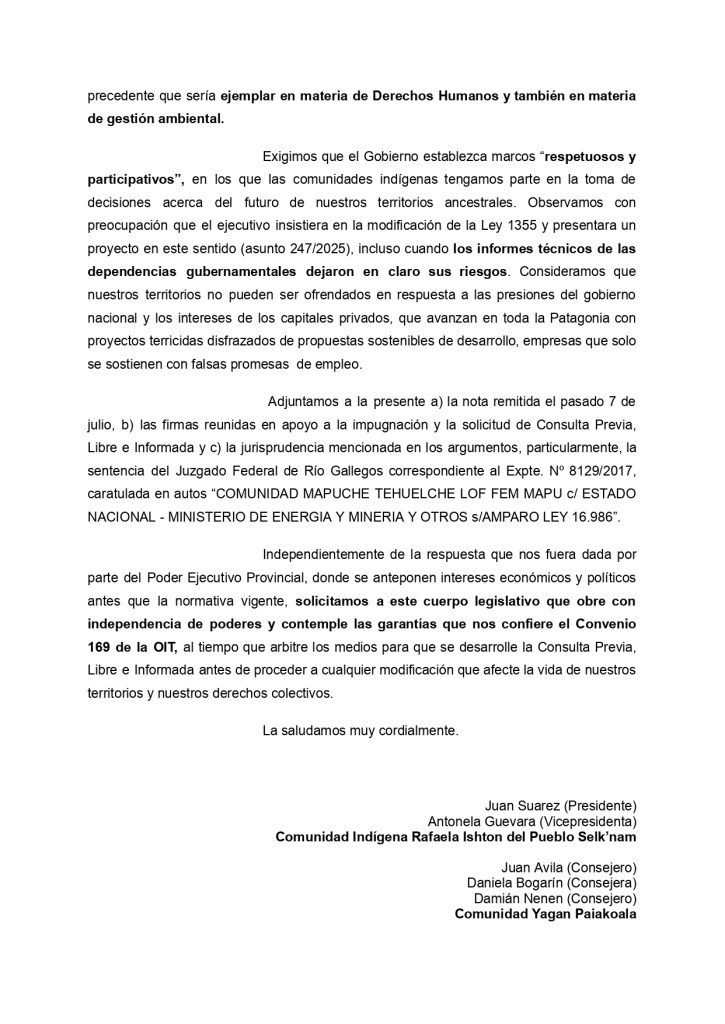 Con estas imposiciones, el proyecto de La Libertad Avanza y del Gobierno Provincial conducido por Gustavo Melella podría ser discutido en el pleno. Así, la Legislatura también niega los derechos adquiridos por los pueblos indígenas, niega la preexistencia de estos pueblos y niega su propia existencia en estos territorios, a la vez que desconoce la Constitución Nacional y los tratados internacionales.