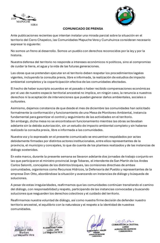 A continuación compartimos el comunicado de las comunidades mapuche Vera y Curruhuinca de San Martín de los Andes (Neuquén), dónde comparten su posicionamiento frente a la situación en el territorio del cerro Chapelco.